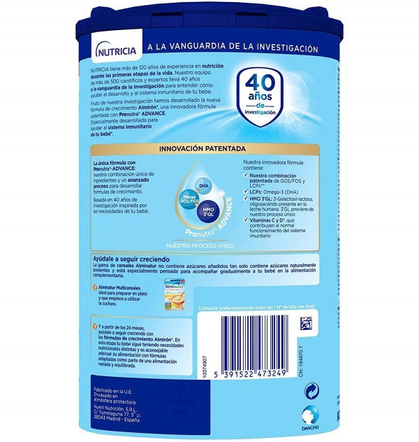 Almirón Advance 3 Leche de Crecimiento 800gr es una leche de crecimiento en polvo que contribuye al normal funcionamiento del sistema inmunitario gracias a su contenido en Vitaminas C y D. Además, contiene oligosacáridos presentes en la leche materna. Indicada a partir de los 12 meses del bebé. Envase de 800gr de producto con un cacito.