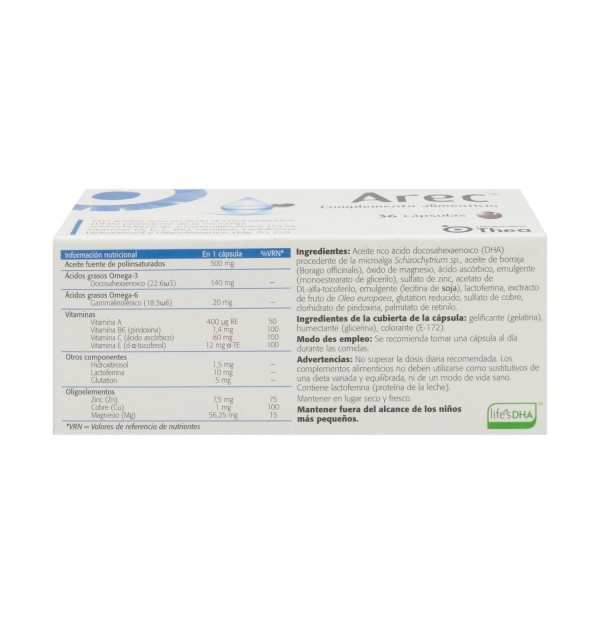 Arec es un complemento alimenticio con aceites ricos en ácido docosahexaenoico (DHA) procedente de la microalga Schizochytrium y Gammalinolénico, Vitaminas (A, E, C, B6), Glutatión, Lactoferrina, Hidroxitirosol y Oligoelementos.
