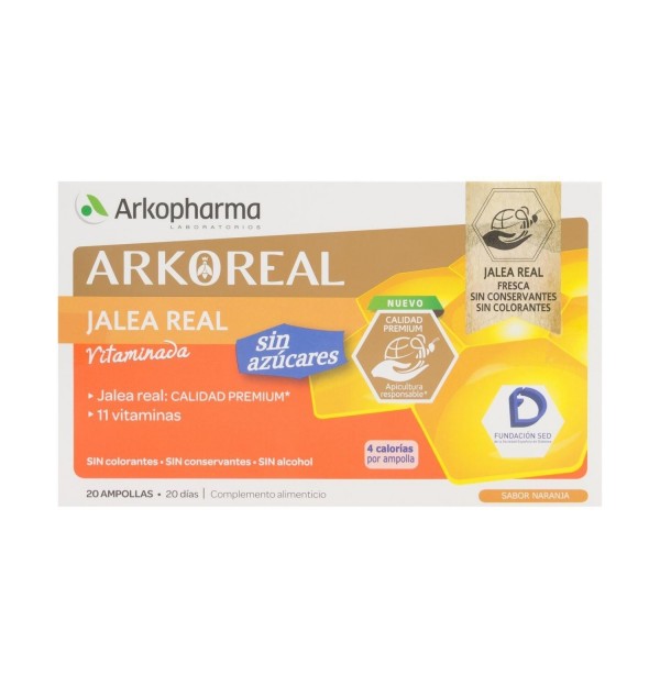 Arkoreal Jalea Real Fresca Vitaminada 20 Ampollas es un complemento alimenticio sin azúcares a base de jalea real y 11 vitaminas. Proporciona una energía extra al organismo, reduce el cansancio diario y se presenta con un aporte reducido de calorías (4 por ampolla). Su formulación ayuda al óptimo estado de la piel, los huesos, los músculos y la visión, así como a un normal funcionamiento del metabolismo energético y del sistema nervioso.