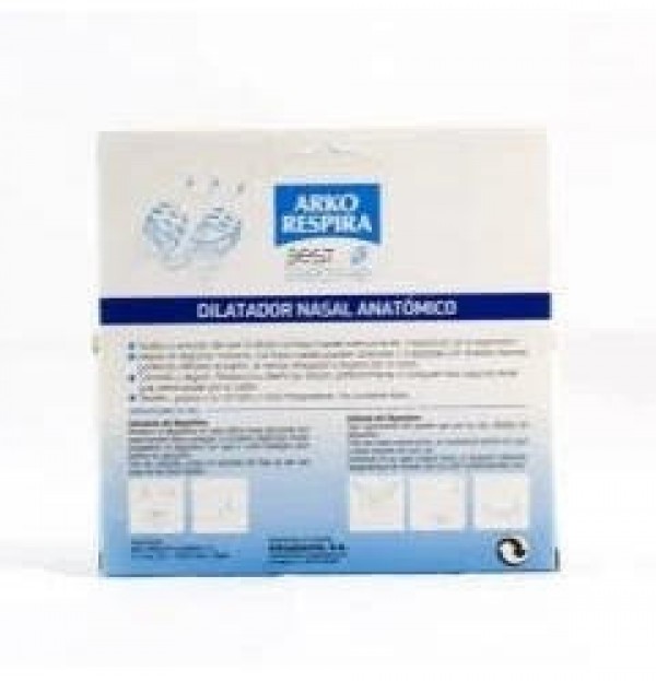 Mejora tu descanso nocturno gracias al dilatador nasal ArkoRespira que favorece la entrada de aire a través de las fosas nasales. Fabricado en silicona hipoalergénica. Mejora tu respiración con el Dilatador Nasal ArkoRespira que favorece la entrada de aire a través de los orificios nasales. El dilatador Nasal ArkoRespira está fabricado en silicona hipoalergénica y tiene un diseño anatómico que permite una perfecta adaptación a los orificios nasales. Su diseño consiste en dos anillas que se introducen en los orificios nasales y que está unidas mediante un puente que permite una perfecta sujeción a la nariz. El dilatador nasal ArkoRespira es muy seguro y discreto. Se puede lavar para reutilizarlos hasta 60 veces. Mejora tu descanso nocturno gracias al dilatador nasal ArkoRespira que ayuda a despejar las fosas nasales toda la noche, evitando que se obstruyan o se colapsen. No contiene látex, está fabricado en silicona de gran calidad e hipoalergénica. Tamaño estándar que se adapta perfectamente evitando su caída. ¿Cómo se coloca el dilatador nasal ArkoRespira? Es muy fácil de colocar. Solo tiene que introducir el dilatador nasal en cada orificio nasal presionando suavemente. Si lo necesita puede humedecer el dilatador con suero fisiológico para facilitar su colocación. Para retirar el dilatador nasal solo tiene que tirar suavemente. Lavar con agua y jabón después de cada uso. Secar y conservar en la cajita protectora que se incluye. Su uso está recomendado para personas que respiran mal por la noche, que roncan o para deportistas. Es unproducto de Arkopharma.