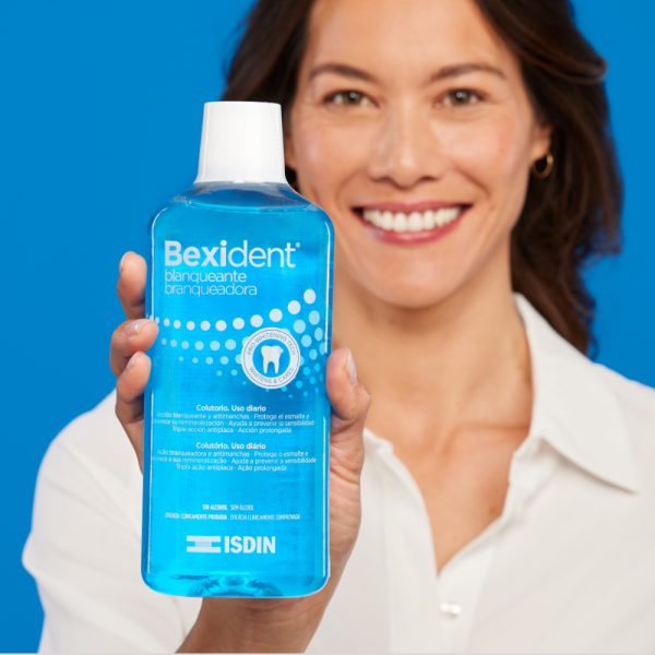 El Bexident Blanqueante Colutorio de ISDIN es el primer colutorio blanqueante con tecnología Pro-Whitening Tech. Este producto genera una acción antimanchas y remineralizante que fortalece y protege el esmalte dental.