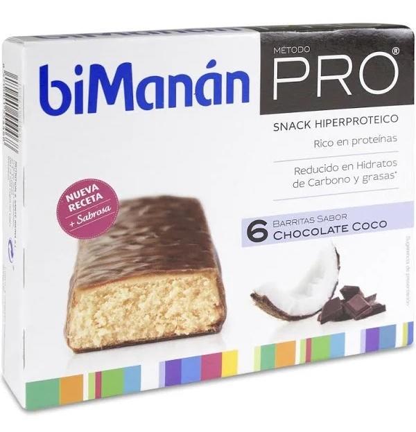 - Barritas hiperproteicas biManán PRO cubiertas de chocolate y en su interior un rico sabor a coco.