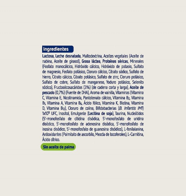 SUERO DESMINERALIZADO, LECHE DESNATADA, MALTODEXTRINA, ACEITES VEGETALES (ACEITE DE NABINA, ACEITE DE GIRASOL), GRASA LÁCTEA, FRUCTOOLIGOSACÁRIDOS (3,0%) (DE CADENA CORTA Y DE CADENA LARGA), MINERALES (FOSFATO MONOCÁLCICO, HIDRÓXIDO CÁLCICO, SULFATO DE MAGNESIO, CITRATO TRISÓDICO, SULFATO DE HIERRO, CLORURO CÁLCICO, HIDRÓXIDO DE POTASIO, CITRATO TRICÁLCICO, CITRATO TRIPOTÁSICO, SULFATO DE ZINC, CLORURO POTÁSICO, SULFATO DE COBRE, SULFATO DE MANGANESO, YODURO POTÁSICO, SELENITO SÓDICO), ACEITE DE PESCADO (0,7%) (FUENTE DE DHA), AROMA DE VAINILLA, VITAMINAS (VITAMINA C, VITAMINA E, NICOTINAMIDA, PANTOTENATO CÁLCICO, VITAMINA A, VITAMINA B6 , VITAMINA B1 , VITAMINA B2 , ÁCIDO FÓLICO, VITAMINA K, BIOTINA, VITAMINA D), CLORURO DE COLINA, TAURINA, EMULGENTE (LECITINA DE SOJA), NUCLEÓTIDOS (5’-MONOFOSFATO DE CITIDINA,  5’-MONOFOSFATO DE URIDINA DISÓDICO, 5’-MONOFOSFATO DE ADENOSINA, 5’-MONOFOSFATO DE INOSINA DISÓDICO, 5’-MONOFOSFATO DE GUANOSINA DISÓDICO), INOSITOL, ANTIOXIDANTES (PALMITATO DE ASCORBILO, MEZCLA DE TOCOFEROLES), L-CARNITINA, BIFIDOBACTERIAS (B. INFANTIS IM1).