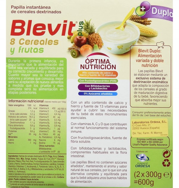 - Blevit plus Duplo 8 Cereales y frutas se prepara de forma instantánea, proporcionando una papilla de textura suave, homogénea y de agradable sabor.