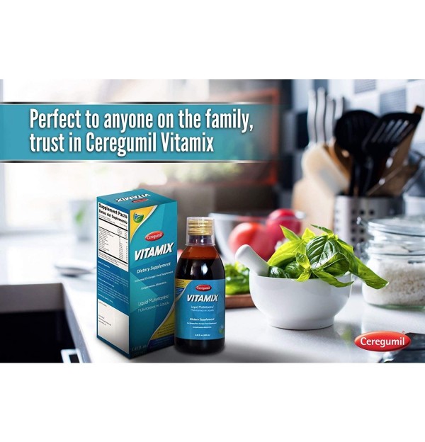 Tomar 10ml de Ceregumil Vitamix con vitaminas 3 veces al día, repartidas en las principales comidas: desayuno, almuerzo y cena.