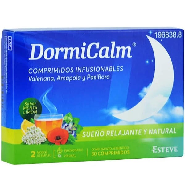Fórmula en comprimidos infusionables con valeriana, pasiflora y amapola de California que permiten el descanso nocturno menos interrupciones. Dormicalm es un complemento alimenticio en forma de comprimidos infusionables, con ingredientes que favorecen el descanso y el logro de un sueño profundo y reparador. Puede tomarse como comprimidos o beberse en infusiones calientes. Ventajas de Dormicalm Dormicalm permite alcanzar un sueño relajante en poco tiempo. Ejerce una acción tranquilizante y de inducción natural del sueño. Contiene valeriana, amapola de California y pasiflora, plantas tradicionales que favorecen un mejor y saludable descanso. Ayuda a controlar el estrés y la sobreexcitación de los sentidos que impide el logro de un sueño profundo y con menos interrupciones a lo largo de la noche. ¿Cómo tomar Dormicalm? Para inducir el sueño, tomar uno o dos comprimidos 30 minutos antes de irse a dormir. Para un efecto relajante durante el día, tomar un comprimido en la mañana, tarde o noche. Para beber, disolver en una taza de agua caliente. Tiene un sabor de menta y limón. No administrar en niños menores de 12 años.