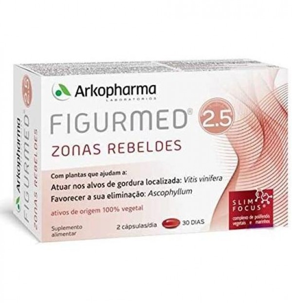 Figurmed 2,5 zonas rebeldes 60cáps es un complemento alimenticio a base de extractos vegetales. Gracias al extracto de uva, ayuda a actuar en las zonas rebeldes con celulitis, generalmente la localizada en los glúteos, muslos y zona abdominal. Contribuye a eliminar la grasa localizada y facilita el control de peso gracias al extracto de ascophyllum.