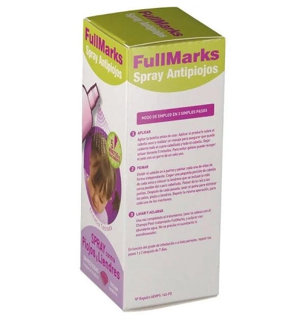 DESCRIPCIÓN FullMarks spray es un spray antipiojos muy eficaz frente a piojos y liendres. Su fórmula sin pesticidas, incolora e inodora actúa rápidamente, en tan solo 5 minutos. Está indicada para niños y adultos con piojos y/o liendres, a partir de 2 años de edad. Para un efecto completo, combinar su aplicación con el champú antipiojos de FullMarks. MODO DE EMPLEO Aplicar Fullmarks sobre el cabello seco. Masajear suavemente hasta que se impregne todo el cuero cabelludo. Dejar actuar durante 5 minutos y peinar con una lendrera para eliminar piojos y liendres. Para un efecto completo, lavar el cabello con el champú post-tratamiento, aplicar y masajear todo el cabello y dejar actuar durante unos minutos antes de enjuagar con abundante agua. Volver a pasar la lendrera para eliminar los piojos muertos. En función de la infestación, volver a repetir el proceso tras 7 días.
