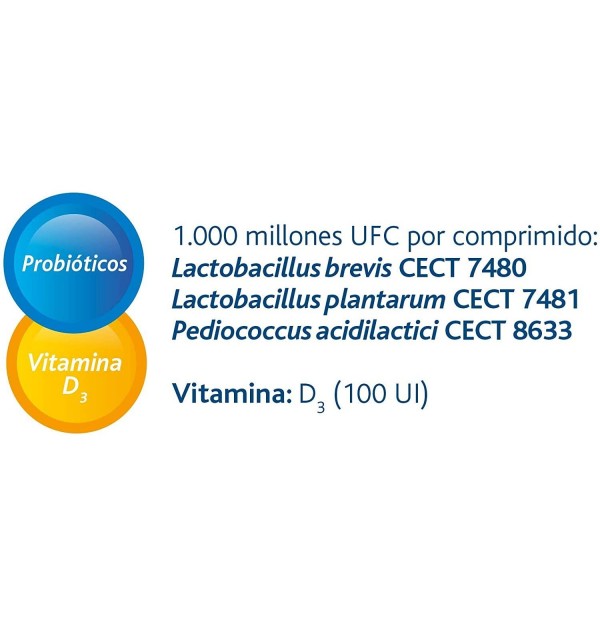 LACTOBACILLUS BREVIS CECT 7480 333 MILLONES UFC LACTOBACILLUS PLANTARUM CECT 7481 333 MILLONES UFC PEDIOCOCCUS ACIDILACTICI CECT 8633 333 MILLONES UFC. VITAMINA D.
