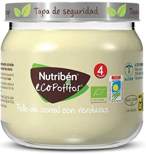 El Ecopotito Nutribén de introducción a las verduras con pollo del corral es un alimento infantil elaborado a base de ingredientes procedentes de la agricultura ecológica.