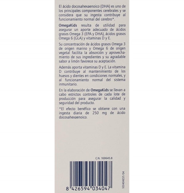 Omega Kids líquido es una solución rica en ácidos grasos Omega 3 y Omega 6, además de en vitaminas D y E, que aportará todos aquellos nutrientes que tus hijos necesitan si pasan por estados carenciales o de necesidad nutricional aumentada. Su agradable sabor a limón hará que tus hijos se lo tomen más a gusto.