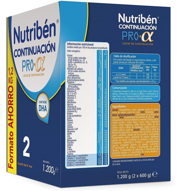 Nutribén leche de continuación. 2 x 600 gramos. Formato ahorro de 1,2 kg. A partir del sexto mes. Con nucleótidos, prebióticos, calcio, hierro, zinc y 8 vitaminas. Contribuye al correcto desarrollo del bebé en todos los ámbitos, y a que crezca sano y fuerte.