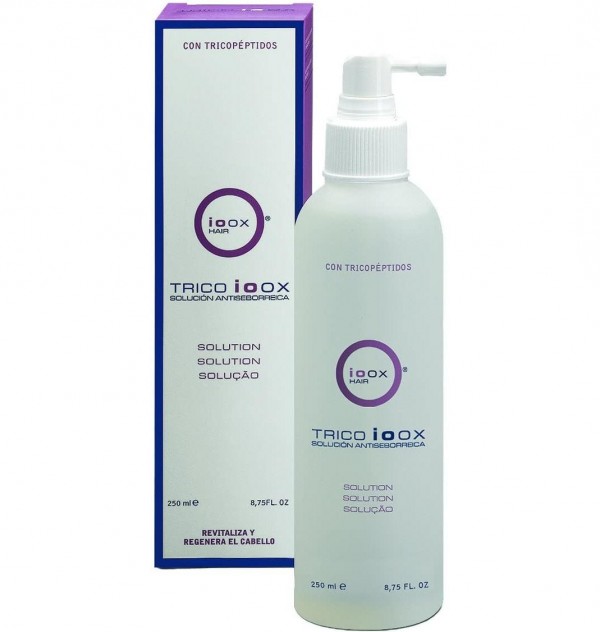 ioox® Tricoioox solución antiseborreica regula con eficacia los procesos seborreicos y de la caída del cabello. Protege el cuero cabelludo favoreciendo la regeneración de la epidermis capilar, mejorando la nutrición y el trofismo capilar.